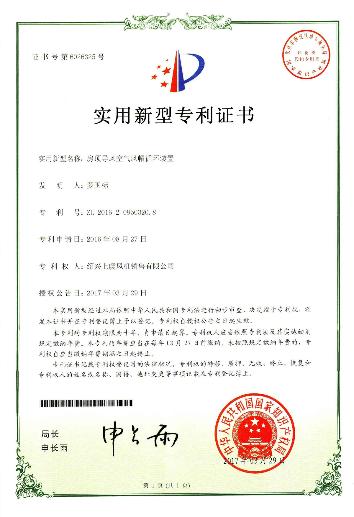 房頂導風空氣風帽循環裝置專利證書