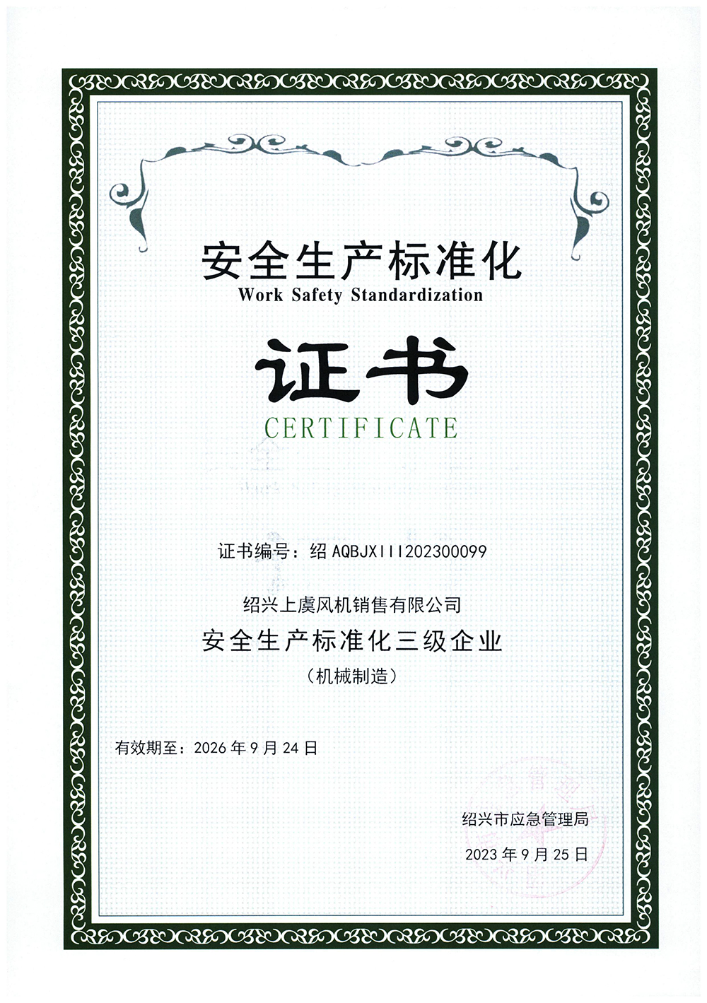 安全生產標準化證書